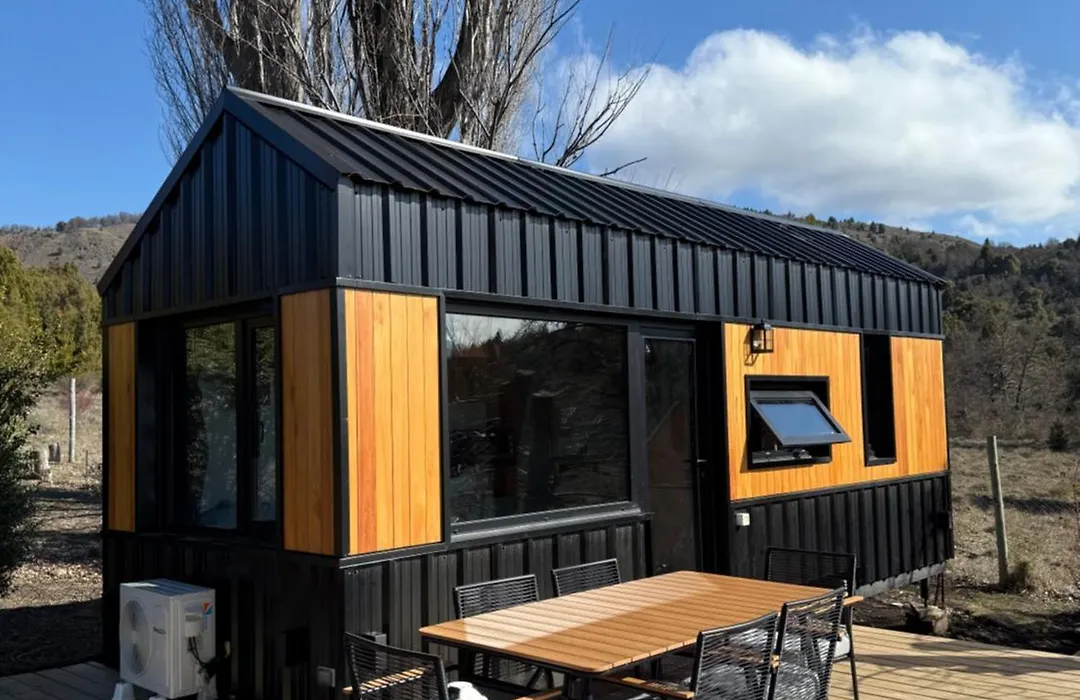 Los servicios de cocina de la propiedad incluyen hervidor eléctrico, nevera y cristalería, proporcionados en un comedor al aire libre.